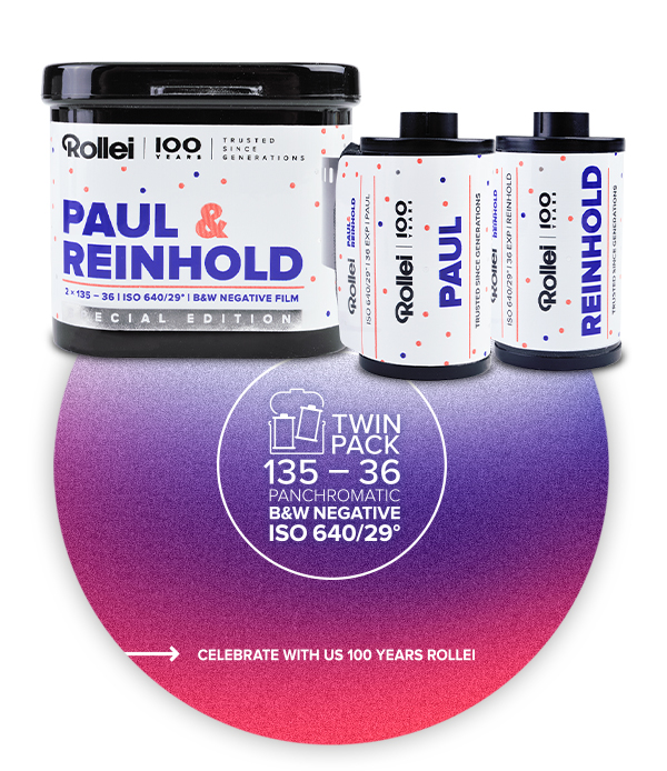 Zum 100-jährigen Bestehen der Marke Rollei erschien im Jahr 2020 eine exklusive Sonderedition: das Twin Pack Paul & Reinhold. Benannt wurde es nach den beiden Gründern Paul Franke und Reinhold Heidecke, die im Jahr 1920 mit ihrer gemeinsamen Vision den Grundstein für eine außergewöhnliche fotografische Erfolgsgeschichte schufen.