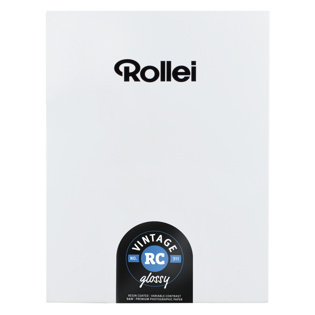 Die weiße Kartonage wird mit dem Rollei-Logo-Folienplott versehen, mit einem Halbmond-Banderolen Sticker verschlossen und auf der Rückseite mit eben diesem versiegelt. Aufgrund der vielen unterschiedlichen Papiergrößen, werden die Banderolen vorgedruckt und im Anschluss in-house individuell bedruckt.